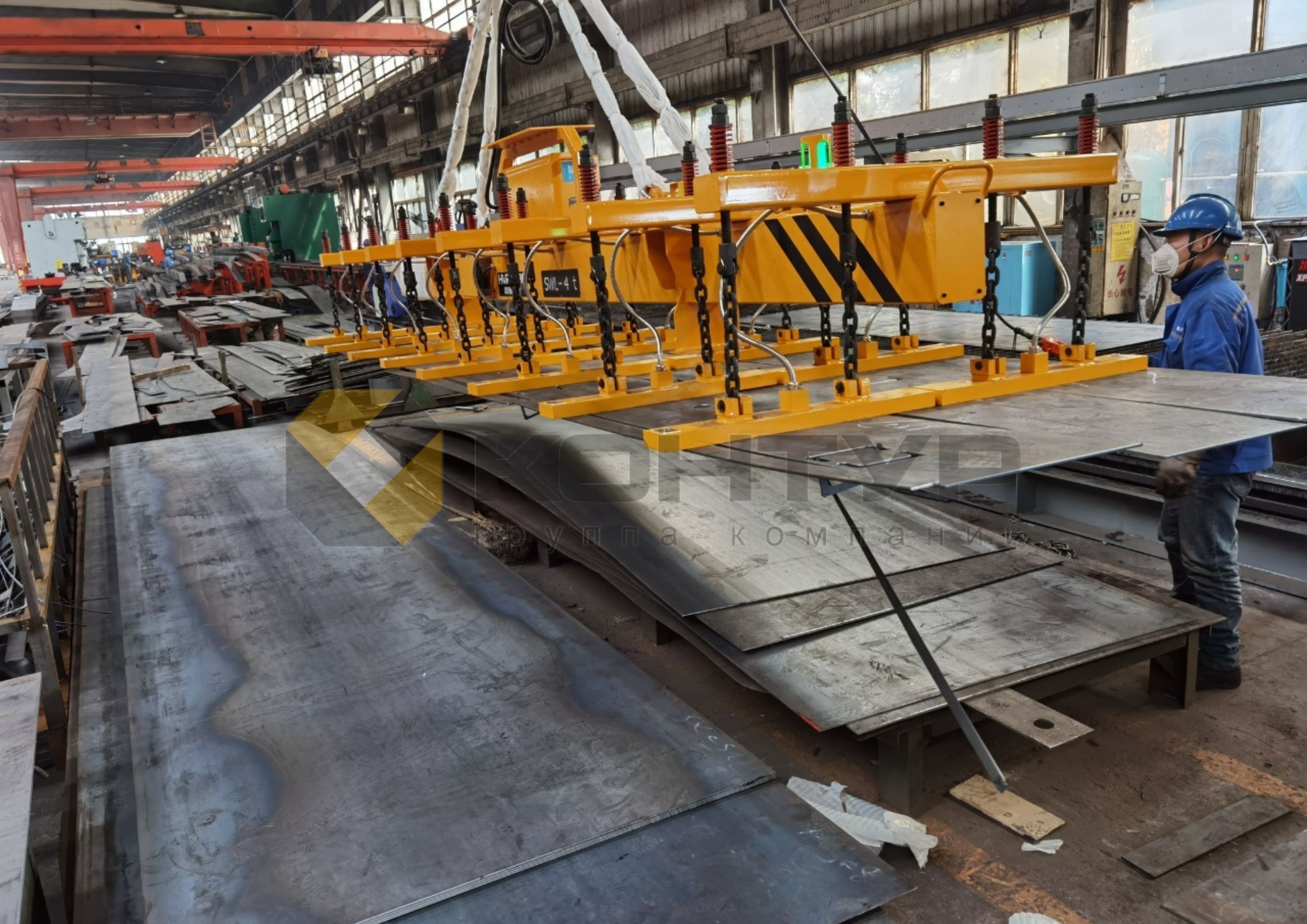 Повышение производительности при резке крупногабаритного листового проката на станках различного типа невозможно без использования специального грузоподъемного оборудования, упрощающего загрузку и размещение стальных листов на рабочем столе станка, а также обеспечивающего быструю выгрузку раскроя, заготовок и обрезков металла. Загрузка крупногабаритных листов на станки осложняется их весом и размерами, как следствие, существует риск повреждения поверхности, деформации или неравномерного распределения нагрузки при перемещении. Выгрузка готовых деталей из крупноформатных листов затруднена из-за необходимости равномерного захвата для предотвращения повреждений и обеспечения безопасности, неровные края и заусенцы металла только усложняют процесс.