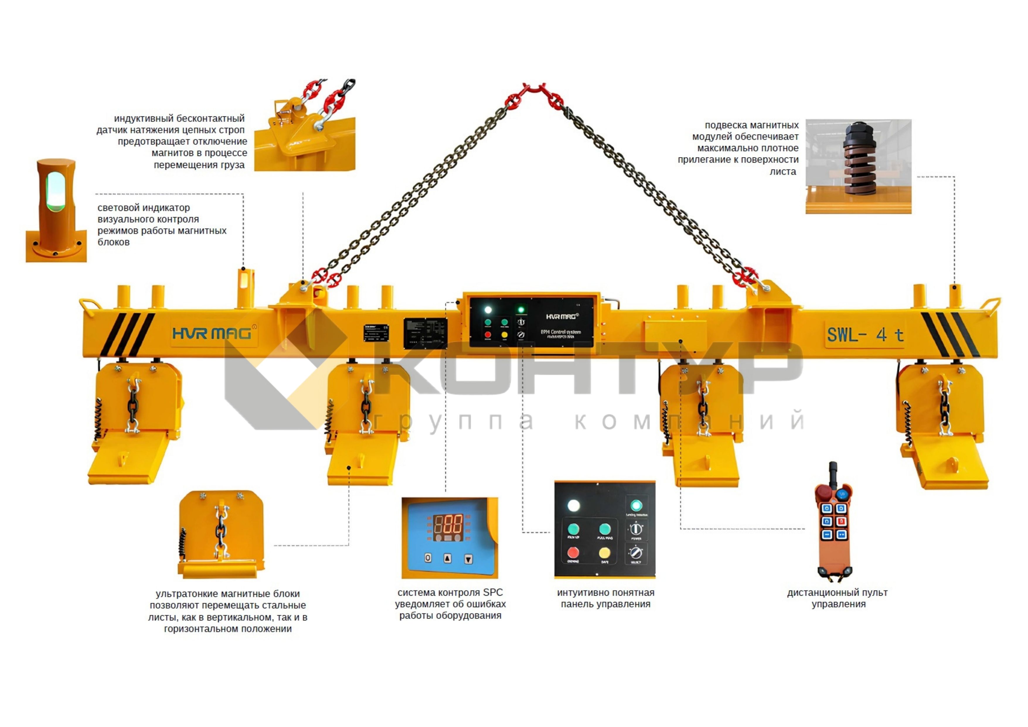 • ультратонкие магнитные модули с электроуправляемыми постоянными магнитами обратимой полярности (AINiCo) обеспечивают постоянную магнитную силу, сохраняемую неограниченное время при отключении питания, благодаря чему не требуется источник резервного питания для безопасной эксплуатации траверсы. Оригинальная конструкция и подвеска магнитных модулей обеспечивает надежный захват как вертикально, так и горизонтально размещенных стальных листов, максимально плотное прилегание магнитов к поверхности металла. Возможность фиксации положения магнитных модулей с помощью цепных стяжек, входящих в комплект поставки, для горизонтального перемещения стального проката.