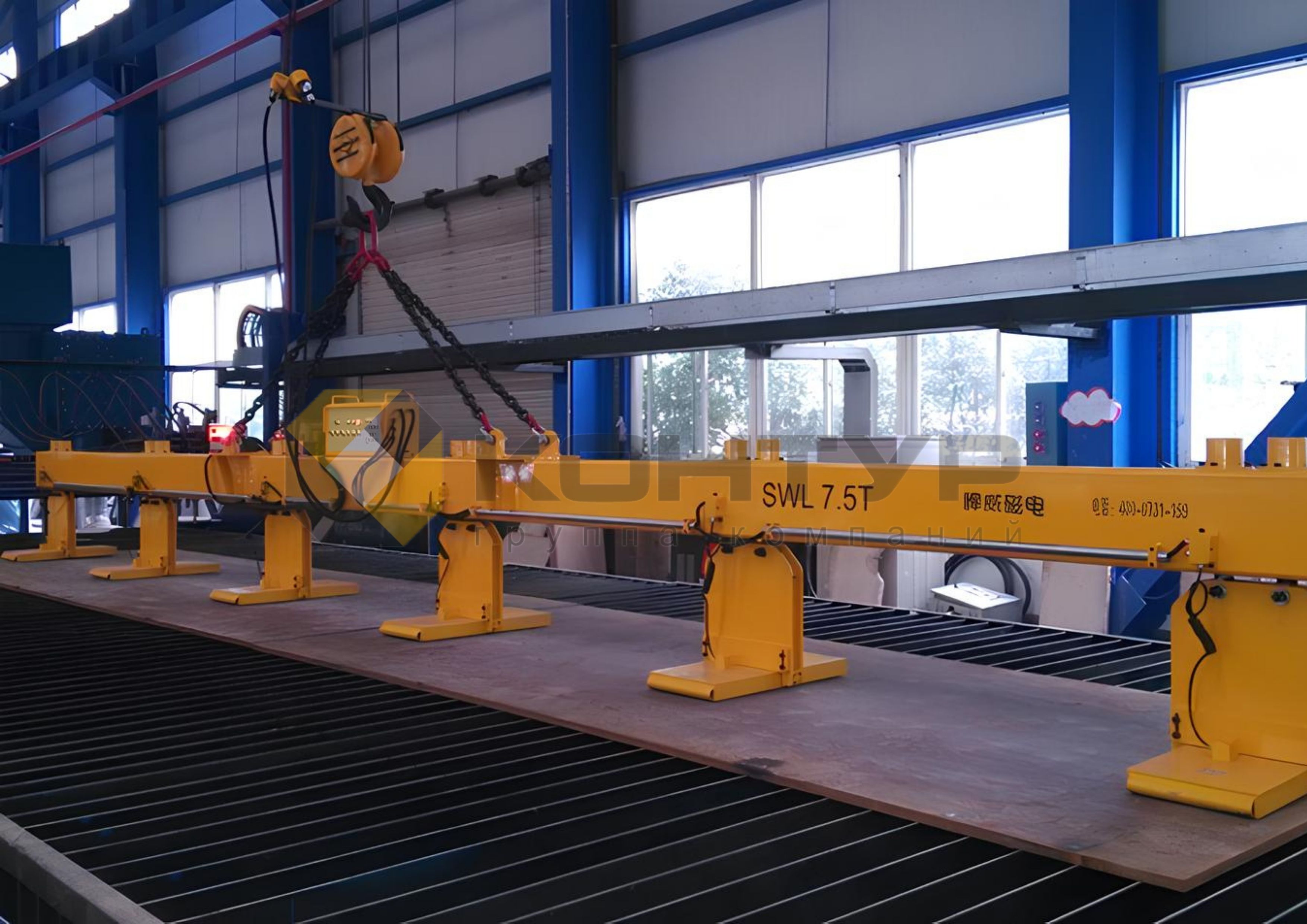 • сварная балка из конструкционной углеродистой стали, покрытая порошковой краской, обеспечивает высокий запас механической прочности, защиту от коррозии и внешних воздействий. На балке размещены паспортная заводская и информационные таблички с указанием модели и заводского номера изделия, максимальной грузоподъемности и зависимости максимальной длины свеса груза от толщины перемещаемого стального листа